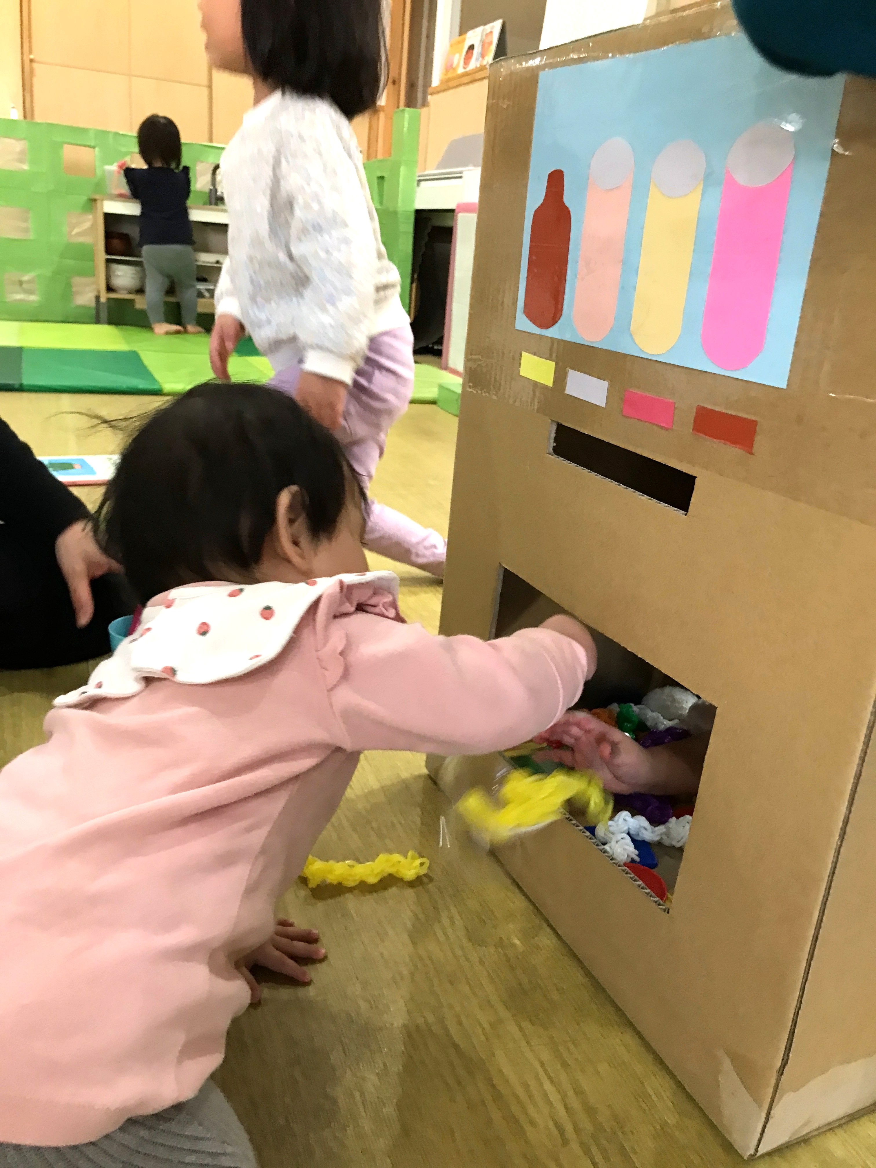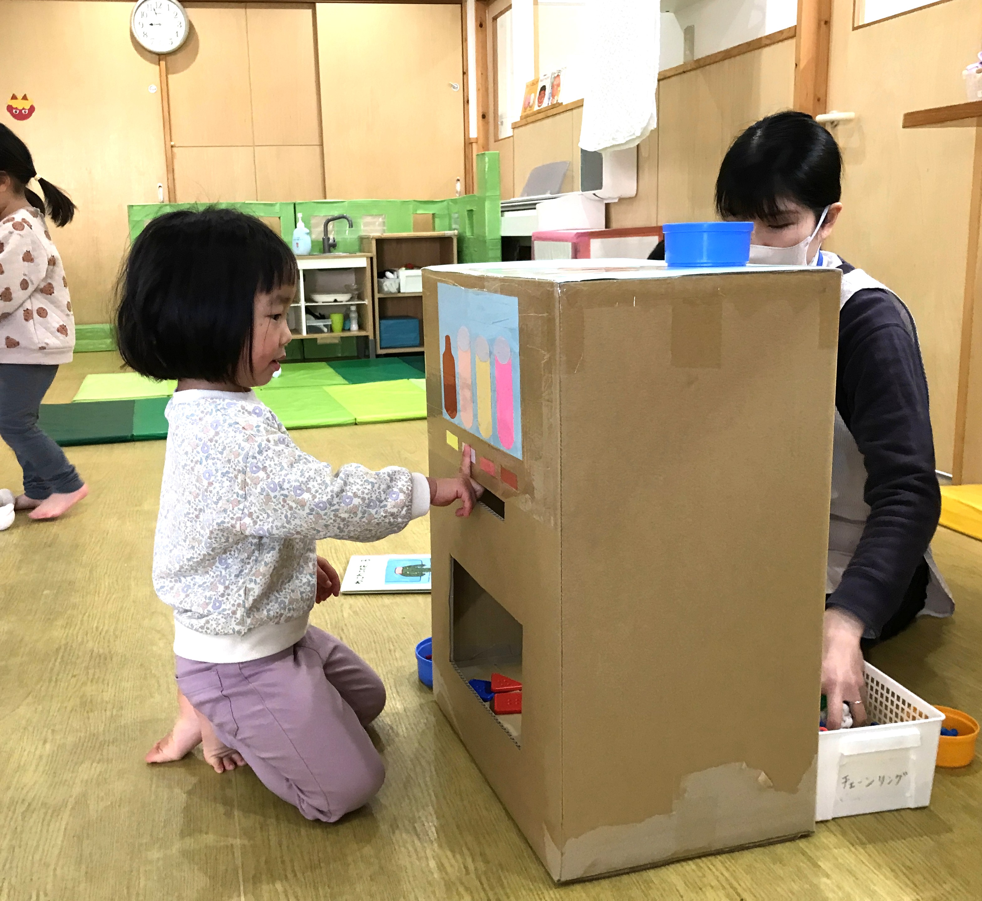 いつもお散歩で見かける自動販売機。「なに飲もうかな」とみんな興味深々です。