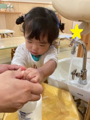 長袖シャツになり、袖を“ぎゅっぎゅ”とまくり、手を洗っています。石鹸のポンプをぎゅ~っと押す姿がとてもかわいいです☆