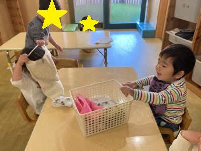 最近は、自分のエプロンを取り、自分でエプロンを付ける姿も見られるようになってきました!