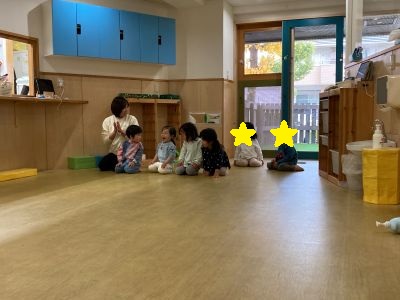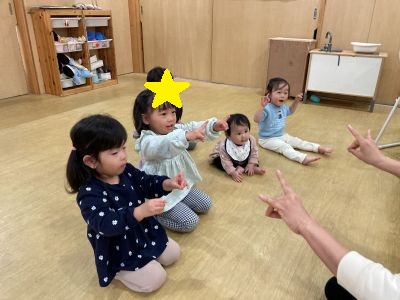 歌を楽しみながら、保育士の手をじっと見て手をキツネの形にしてみることも楽しんでいます。このキツネの形は年少さんくらいで出来るようになるようですが、毎日歌っていると、いつのまにかできているお友だちもいますよ♪自分で考えられるよう、保育士がやり方を教えることはしていません。