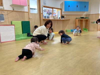ハイハイで興味のあるところへ行ったり、お友だちや保育士の元まで来る姿があるので、より全身を使って身体を動かす楽しさを知ってほしいと思い、トンネルを準備しました!