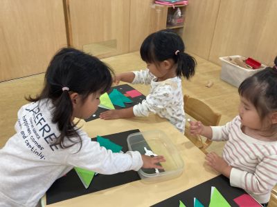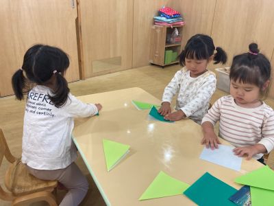 2歳児は、お人形に洋服を着せたり、洋服を畳んだり少しずつ指先が器用になる姿があり、日々遊んでいる折り紙をペタンと三角に折り、クリスマスツリーを作りました。