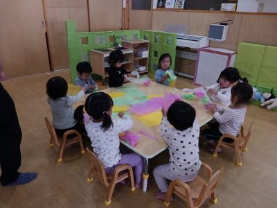 また、のり付けも経験しました。指先に少しつけ、折り紙を張り付けました。