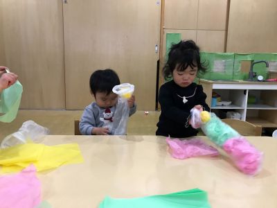 1歳児は、カバンに玩具を入れたり、おままごとで小さいカップに作ったご飯を入れたりする姿があるので、花紙を傘袋に入れることを楽しみました☆
