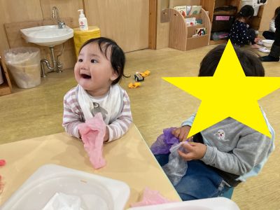 新聞紙遊びを通して、様々な感触や音を楽しみました。また、これから指先が発達して自分で破ったり、丸めたりする楽しさも味わえたらなと思っています!